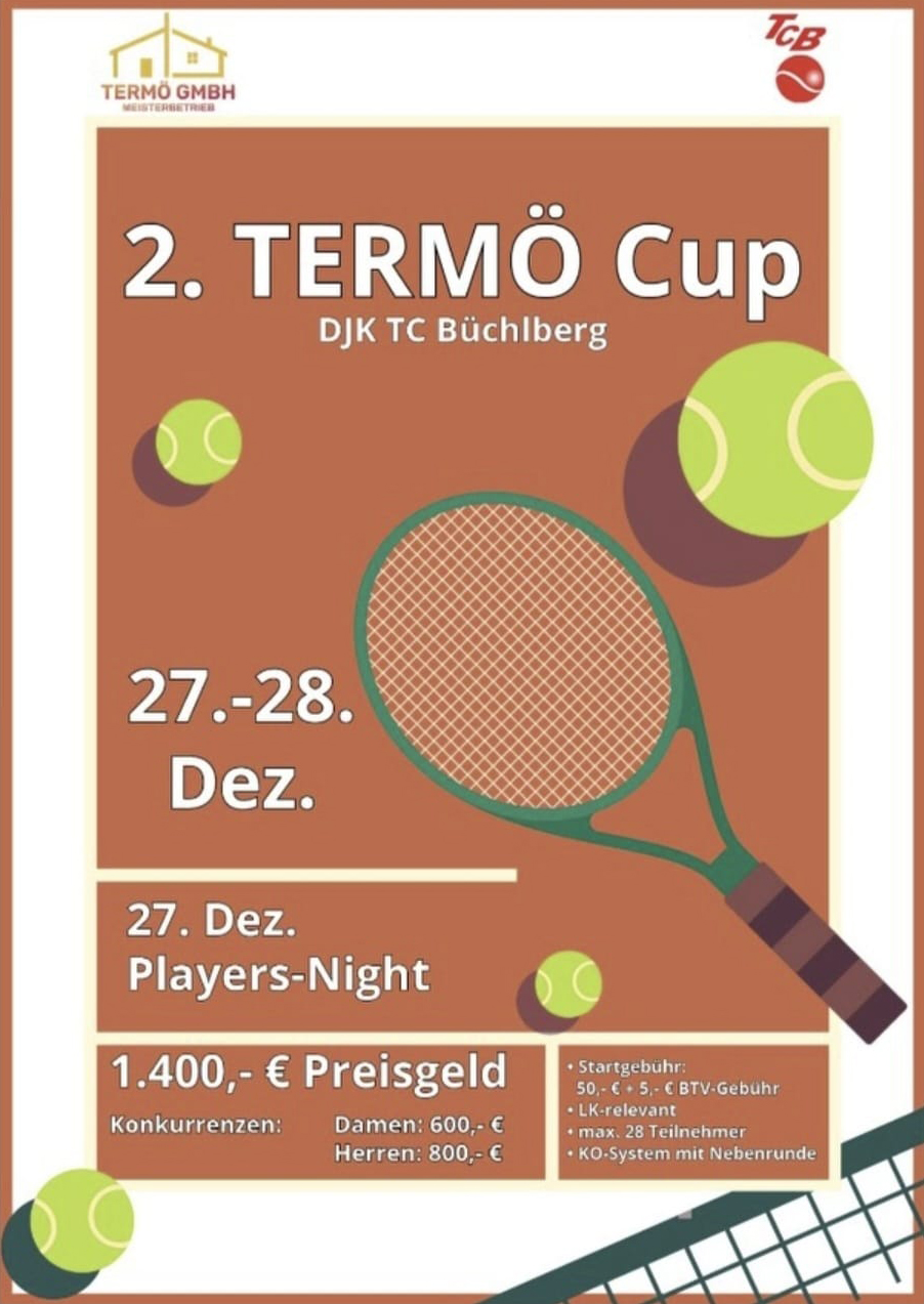 Der legendäre Termö Cup geht in die zweite Runde: Zwischen den Feiertagen findet in der Büchlberger Tennishalle wieder das große Preisgeldturnier für Herren und Damen statt. Am 27. und 28. Dezember 2025 kämpfen wieder die besten Spielerinnen und Spieler aus der Region um 1400 Euro Gesamtpreisgeld. Am Samstagabend, 27.12., findet auch wieder eine große Players Night statt, sodass Sport, Spaß und Geselligkeit optimal vereint sind. Meldet euch an!
