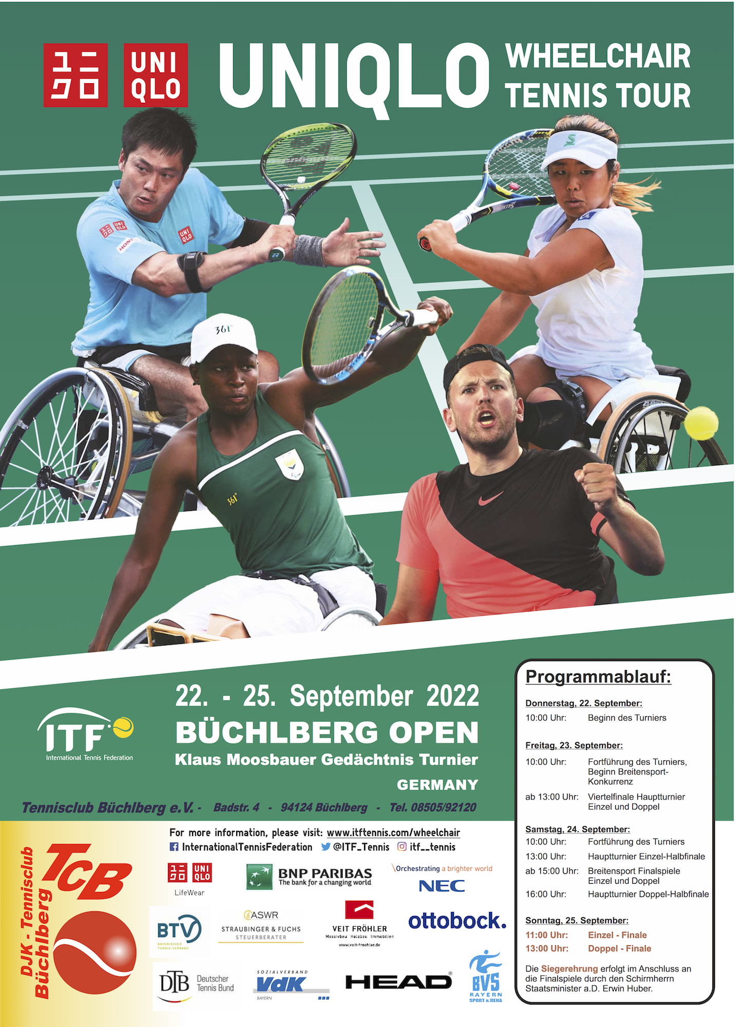 Hochklassiges Rollstuhltennis wurde den Tennisfans von Donnerstag bis Sonntag (22. bis 25.9.2022) in der Tennishalle des DJK-TC Büchlberg geboten. Nach zwei Jahren Coronapause konnten die Büchlberg Open als internationales ITF-Future-Turnier endlich wieder stattfinden. 24 Herrenspieler aus acht Nationen waren am Start, um im Einzel und Doppel um 3000 Dollar Preisgeld, Weltranglistenpunkte und den Bayerischen Löwen, den Ehrenpreis des Bayerischen Ministerpräsidenten, zu kämpfen. Die Schirmherrschaft lag in den bewährten Händen von Staatsminister a.D. Erwin Huber, der zusammen mit seiner Frau Helma das Turnier bereits seit 19 Jahren unterstützt.